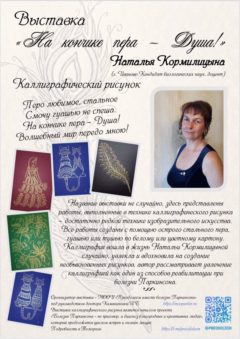 | МООИ "Преодолеем вместе" в апреле 2024 запустила новый проект "БП - не приговор, а руководство к действию", приуроченный к Дню борьбы с болезнью Паркинсона. Художественную выставку проводили впервые, в одной из московских библиотек.Работы были прекрасные, трудно поверить, что хрупкая женская рука могла создать такую красоту! Выставка была настолько необычной и интересной,что и до сих пор продолжает свое путешествие по Москве от одной площадки до другой и сопровождается творческими вечерами и мастер-классами Натальи.